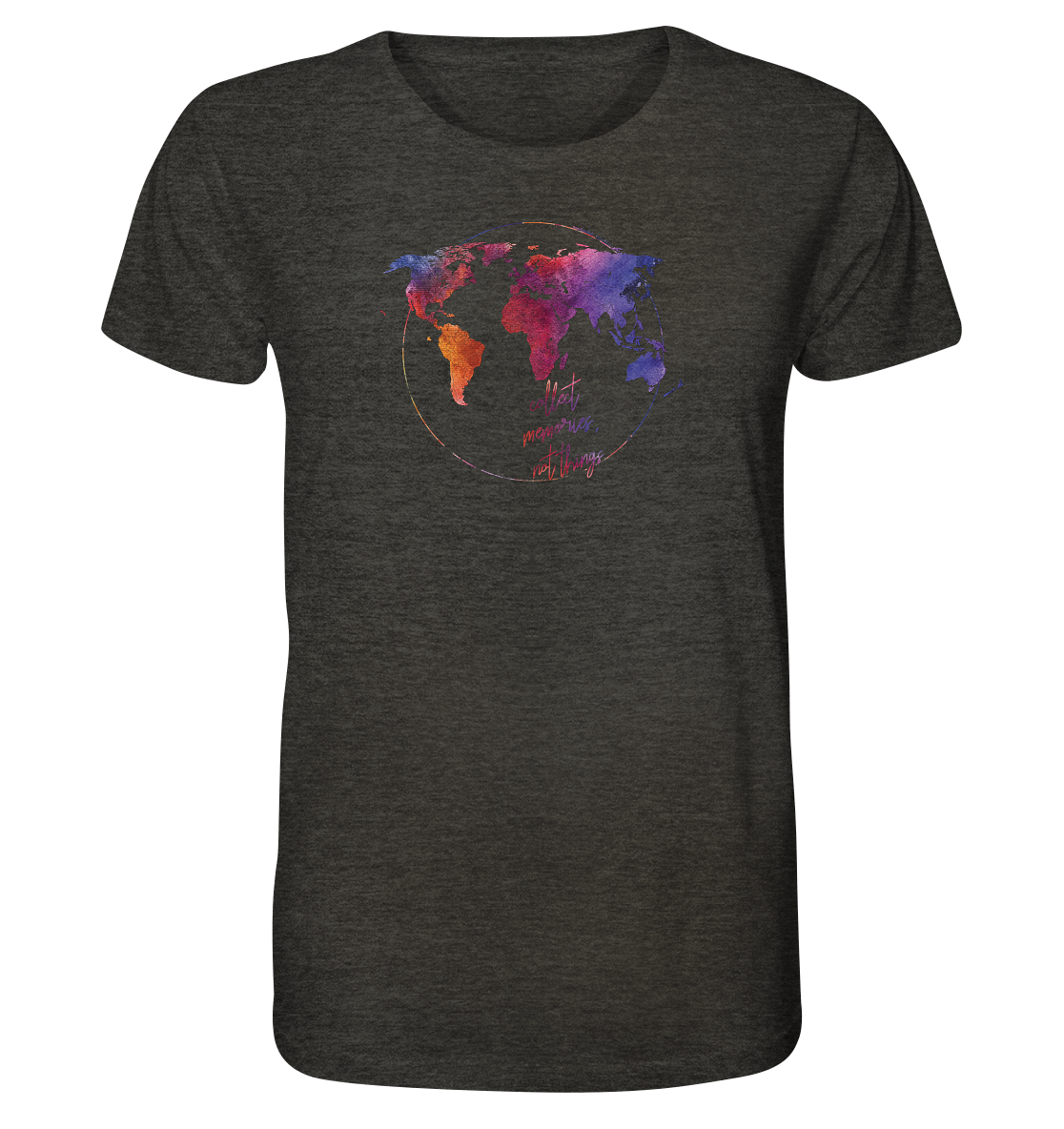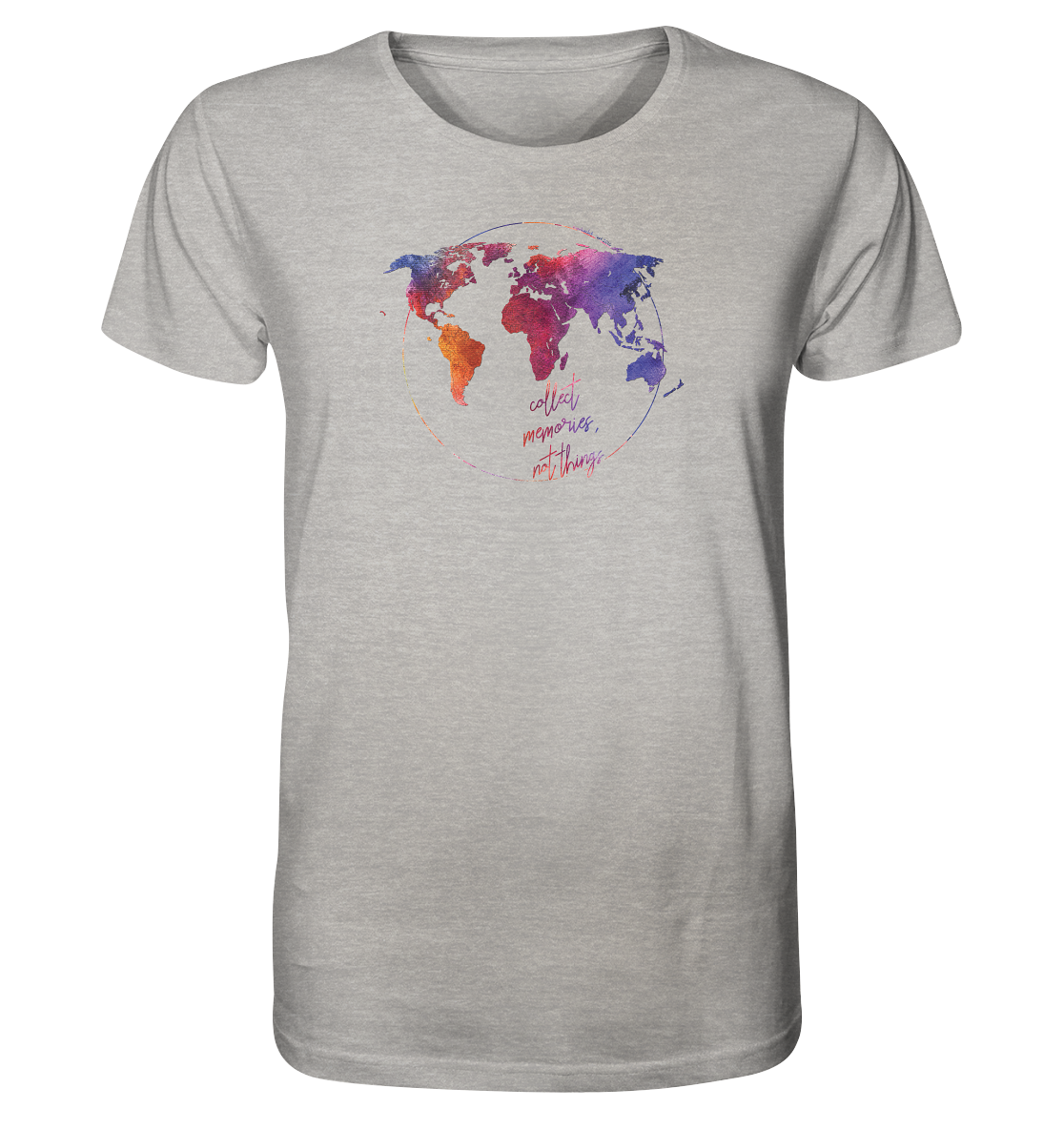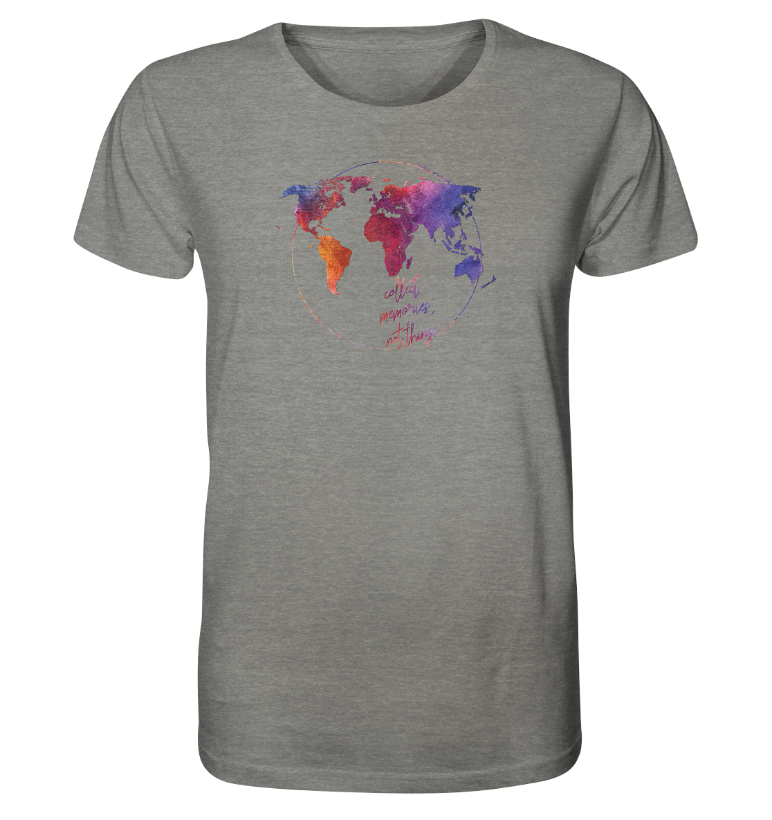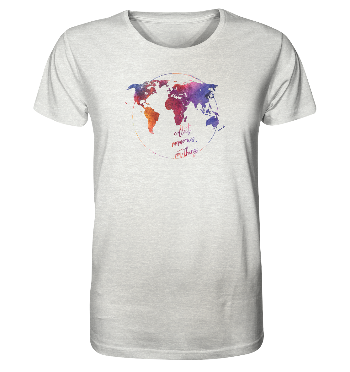 Wir möchten in der "Weltkarten Kollektion" ein Design anbieten, das deinen Blick auf die ganze Welt einfängt und direkt auf dein T-Shirt, deinen Pullover oder deine Tasche bringt. Die Weltkarte ist äußerst präzise mit Ländergrenzen und den 10 größten Seen der Welt von uns gestaltet. Unterhalb der Karte befindet sich der Slogan "Ich habe Collect memories, not things". Denn genau darum geht es, zieh dein Lieblingsshirt an, geh raus und sammel tolle Erinnerungen für schlechtere Zeiten. Die Weltkarten-Mode bieten wir in drei exklusiven Designs an.